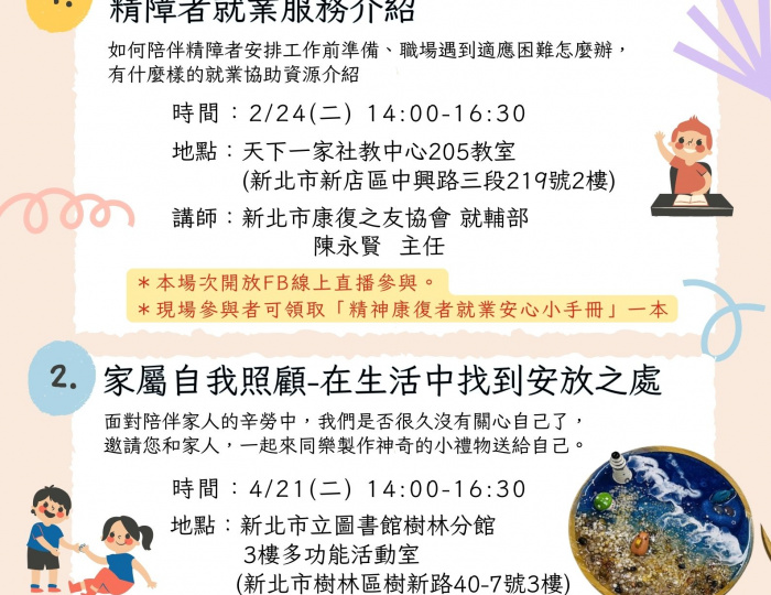 我們是由新北市的精神障礙者及家屬組成的自助團體,相信每一位精神障礙者都有康復的潛能與機會,而且和您我一樣,可以自在的於社區中生活。 我們不只協助精神障礙者融入社會,同時也與精神障礙家庭一起勇敢面對歧視與污名,期待以多元服務,陪伴精神障礙者創造不一樣的人生!