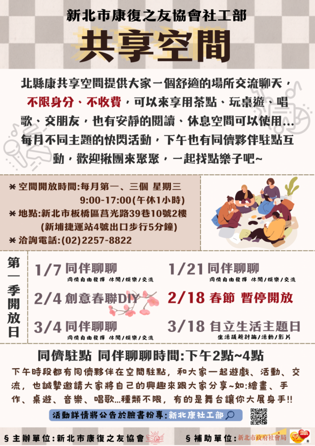 - 地點:新北康社工部(新北市板橋區莒光路39巷10號2樓